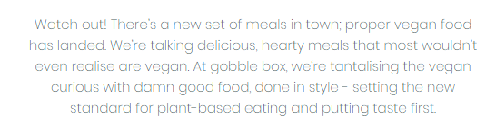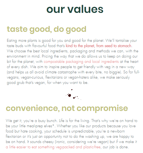 Let’s say you make vegan convenience food, like gobble box. They list just two values on their page: ‘Taste good, do good’ and ‘Convenience, not compromise’. They live their values by making ready meals that taste good and are plant-based. They embody their values in their voice with their tone of voice: short, light, positive copy that doesn’t labour the point.
